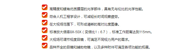 | 放大倍率 | 连续变倍,标准配置:8X-50X;选配目镜及辅助物镜,放大倍率4X-200X |